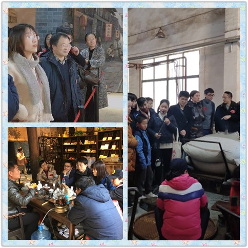羊楼洞是青砖茶的原产地,已有两百多年的生产历史。青砖茶外形长为长方砖形,色泽青褐,香气纯正,滋味醇和,汤色橙红,叶底暗褐。它是中东、北亚、蒙古、俄罗斯及中国北方少数民族地区人们日常饮用的必需品。如今,羊楼洞古镇不仅遍布大大小小的茶庄,而且专门修建了茶叶博物馆,创办了多家茶厂。老师们在商铺品尝各式青砖茶和米砖茶,在博物馆了解古镇的历史与现状,在当地知名茶厂实地考察青(米)砖茶的复杂加工工艺,在雷家大院领略古代建筑的精美繁复,不仅品尝到原汁原味的青砖茶,而且增加了见识,开阔了视野,巩固了情谊。